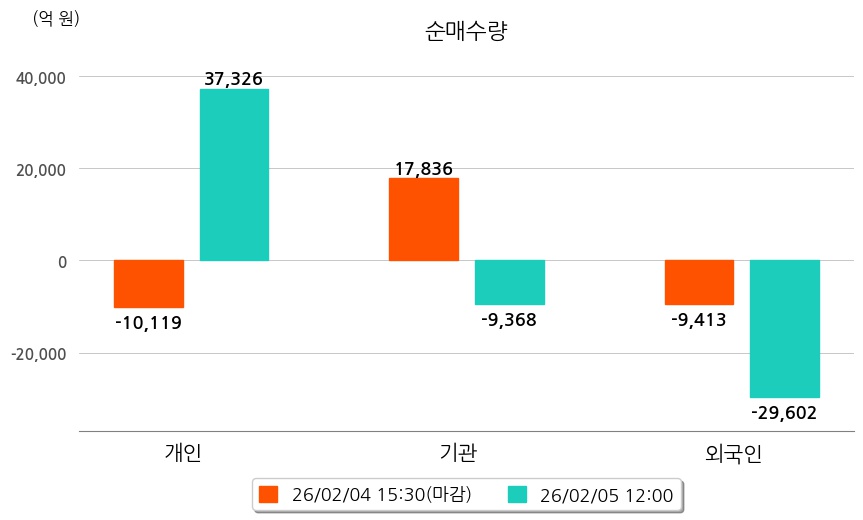 투자자별 동향을 살펴보면 기관은 9,368억 원 순매도했으며, 외국인은 29,602억 원 순매도했다. 개인은 37,326억 원 순매수했다.