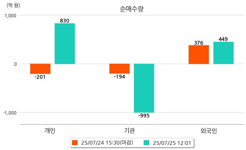 투자자별 동향을 살펴보면 기관은 995억 원 순매도했으며, 외국인은 449억 원 순매수했다. 개인은 830억 원 순매수했다.
