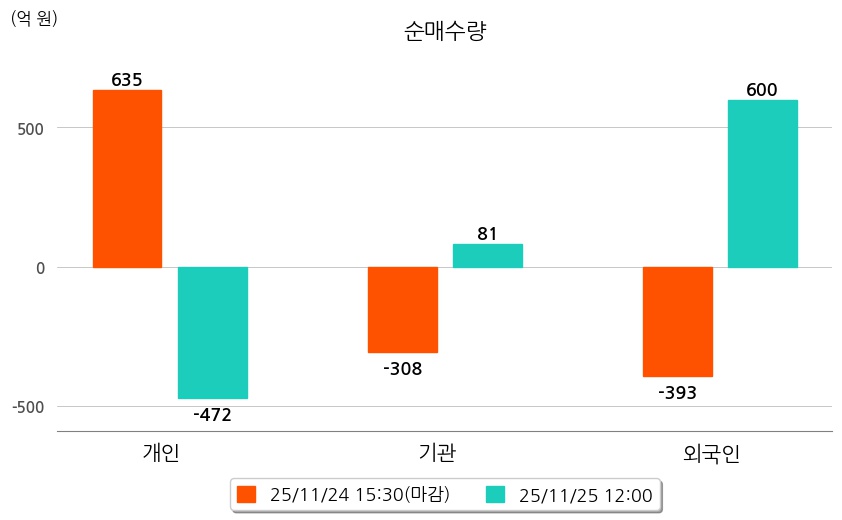투자자별 동향을 살펴보면 기관은 81억 원 순매수했으며, 외국인은 600억 원 순매수했다. 개인은 472억 원 순매도했다.
