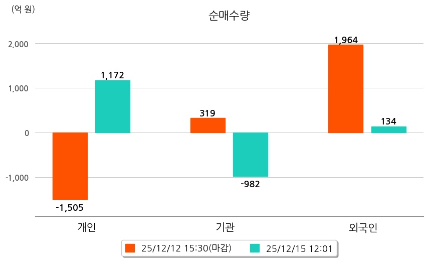 투자자별 동향을 살펴보면 기관은 982억 원 순매도했으며, 외국인은 134억 원 순매수했다. 개인은 1,172억 원 순매수했다.