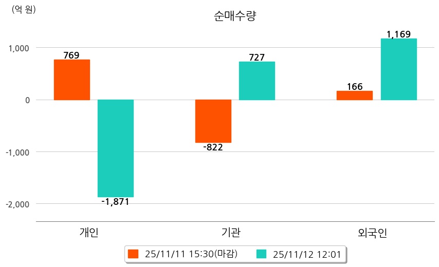 투자자별 동향을 살펴보면 기관은 727억 원 순매수했으며, 외국인은 1,169억 원 순매수했다. 개인은 1,871억 원 순매도했다.