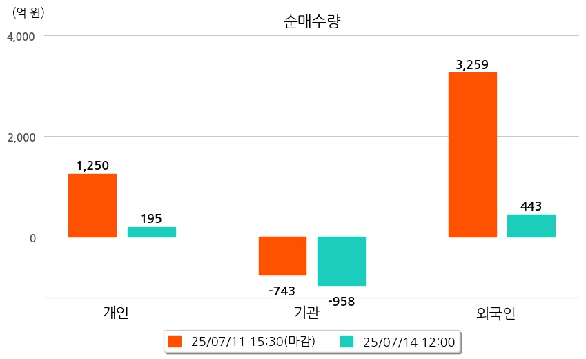 투자자별 동향을 살펴보면 기관은 958억 원 순매도했으며, 외국인은 443억 원 순매수했다. 개인은 195억 원 순매수했다.