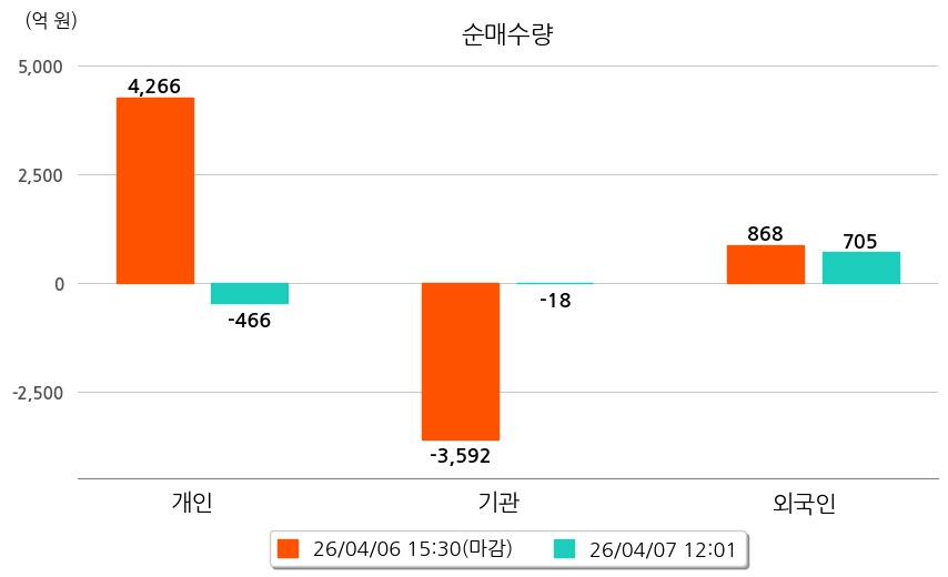 투자자별 동향을 살펴보면 기관은 18억 원 순매도했으며, 외국인은 705억 원 순매수했다. 개인은 466억 원 순매도했다.