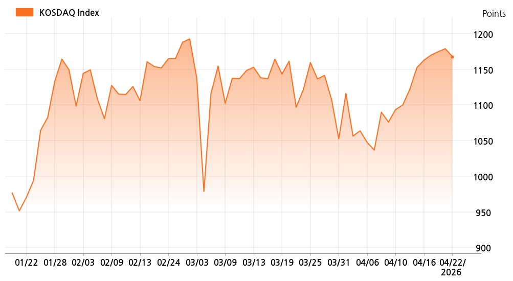 22일 정오 현재 코스닥(1,168.12p, 10.91p, -0.93%)는 기관 매도가 늘면서 하락세를 보이고 있다.