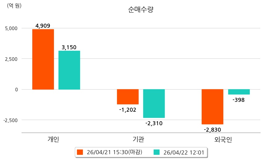 투자자별 동향을 살펴보면 기관은 2,310억 원 순매도했으며, 외국인은 398억 원 순매도했다. 개인은 3,150억 원 순매수했다.