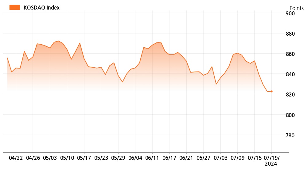 19일 코스닥(822.75p, +0.27p, +0.03%)는 개인 매수 우위 속에 전 거래일보다 0.27p 상승한 822.75p로 장을 마감했다.