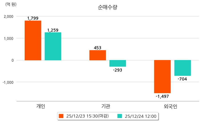 투자자별 동향을 살펴보면 기관은 293억 원 순매도했으며, 외국인은 704억 원 순매도했다. 개인은 1,259억 원 순매수했다.