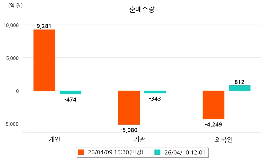 투자자별 동향을 살펴보면 기관은 343억 원 순매도했으며, 외국인은 812억 원 순매수했다. 개인은 474억 원 순매도했다.