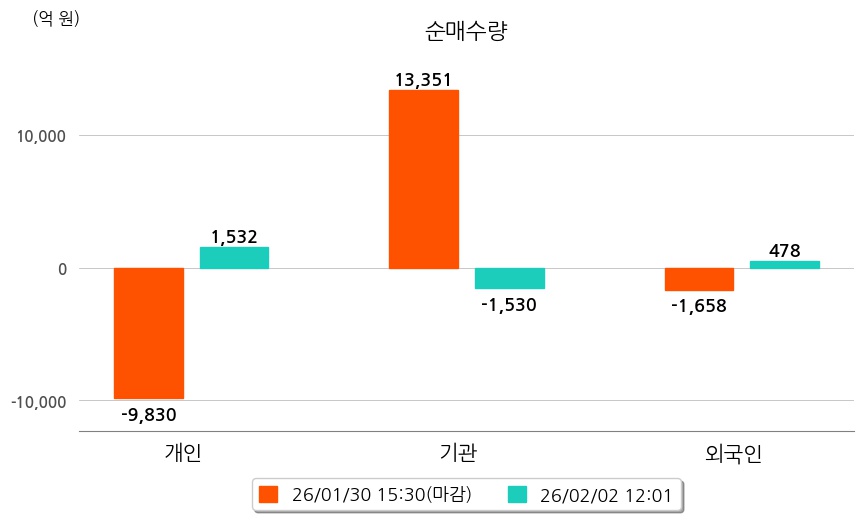 투자자별 동향을 살펴보면 기관은 1,530억 원 순매도했으며, 외국인은 478억 원 순매수했다. 개인은 1,532억 원 순매수했다.
