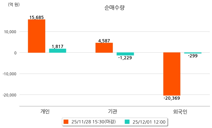 투자자별 동향을 살펴보면 기관은 1,229억 원 순매도했으며, 외국인은 299억 원 순매도했다. 개인은 1,817억 원 순매수했다.