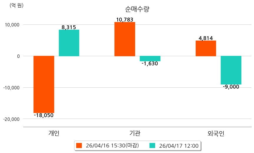 투자자별 동향을 살펴보면 기관은 1,630억 원 순매도했으며, 외국인은 9,000억 원 순매도했다. 개인은 8,315억 원 순매수했다.
