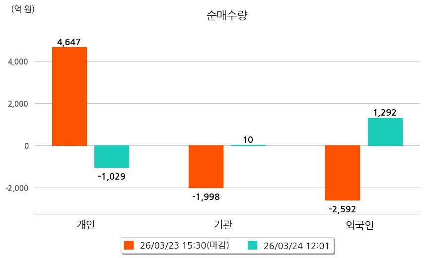 투자자별 동향을 살펴보면 기관은 10억 원 순매수했으며, 외국인은 1,292억 원 순매수했다. 개인은 1,029억 원 순매도했다.