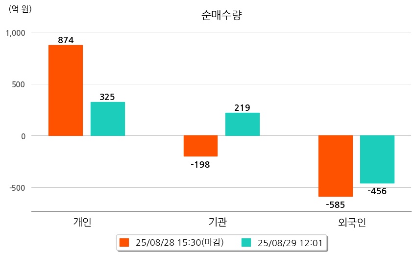 투자자별 동향을 살펴보면 기관은 219억 원 순매수했으며, 외국인은 456억 원 순매도했다. 개인은 325억 원 순매수했다.