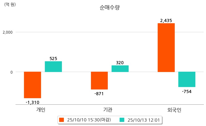 투자자별 동향을 살펴보면 기관은 320억 원 순매수했으며, 외국인은 754억 원 순매도했다. 개인은 525억 원 순매수했다.