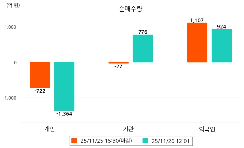 투자자별 동향을 살펴보면 기관은 776억 원 순매수했으며, 외국인은 924억 원 순매수했다. 개인은 1,364억 원 순매도했다.