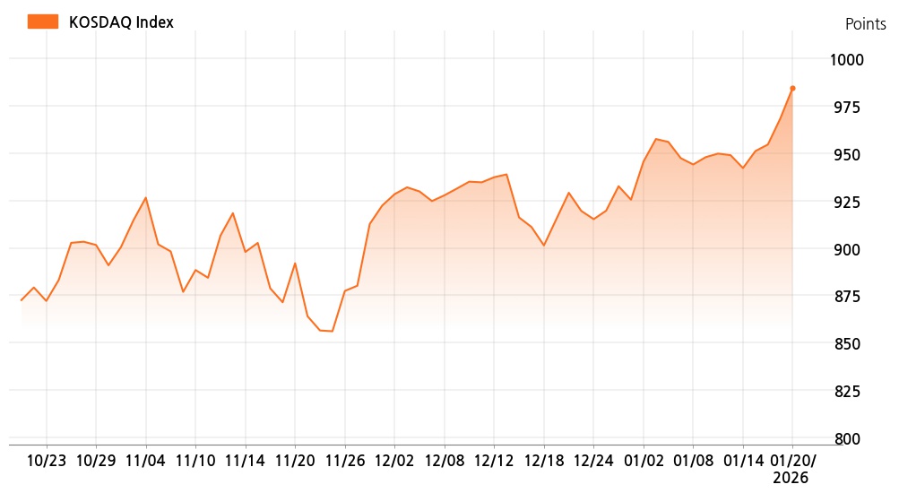 20일 정오 현재 코스닥(984.62p, 16.26p, +1.68%)는 기관 매수가 늘면서 상승세를 보이고 있다.