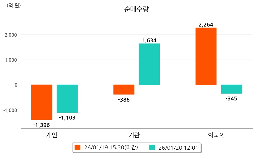 투자자별 동향을 살펴보면 기관은 1,634억 원 순매수했으며, 외국인은 345억 원 순매도했다. 개인은 1,103억 원 순매도했다.