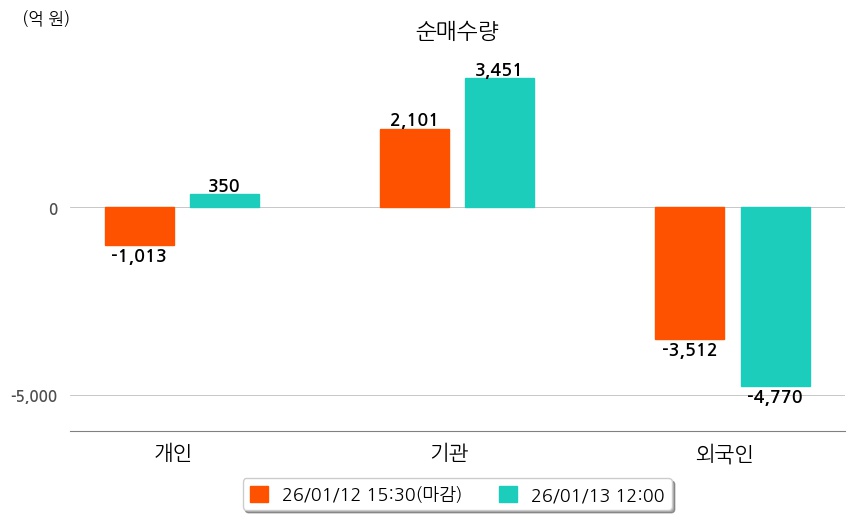 투자자별 동향을 살펴보면 기관은 3,451억 원 순매수했으며, 외국인은 4,770억 원 순매도했다. 개인은 350억 원 순매수했다.