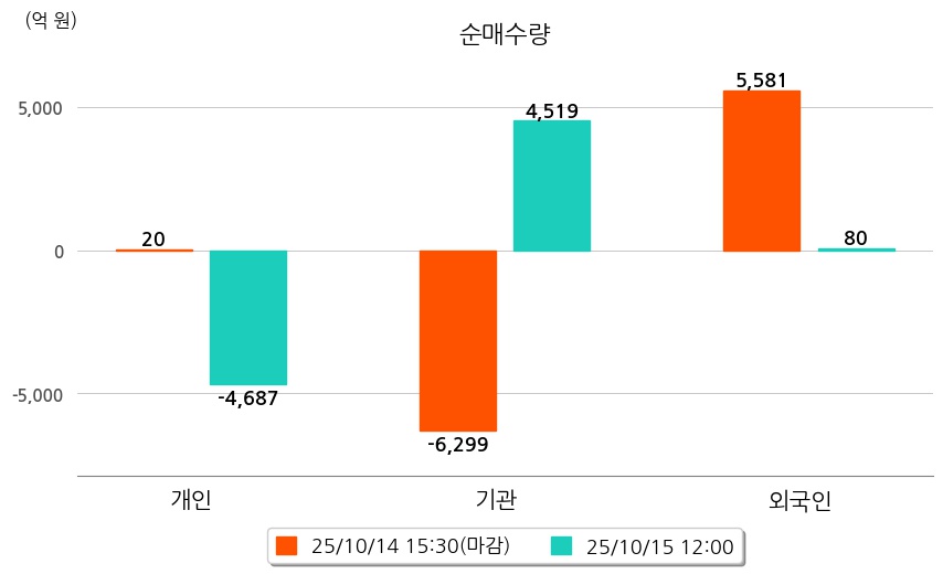 투자자별 동향을 살펴보면 기관은 4,519억 원 순매수했으며, 외국인은 80억 원 순매수했다. 개인은 4,687억 원 순매도했다.