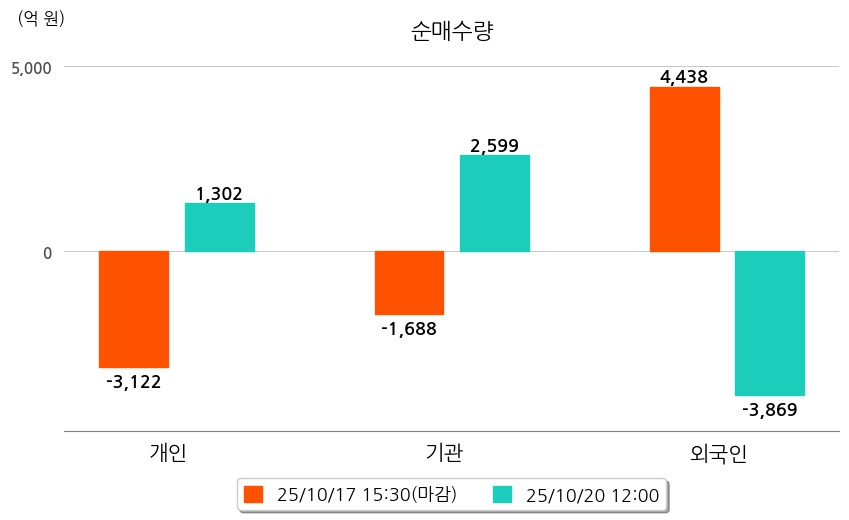 투자자별 동향을 살펴보면 기관은 2,599억 원 순매수했으며, 외국인은 3,869억 원 순매도했다. 개인은 1,302억 원 순매수했다.