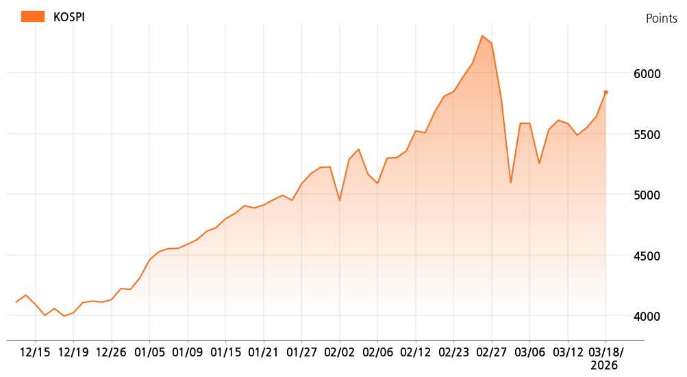 18일 정오 현재 코스피(5,843.14p, 202.66p, +3.59%)는 기관 매수가 늘면서 상승세를 보이고 있다.