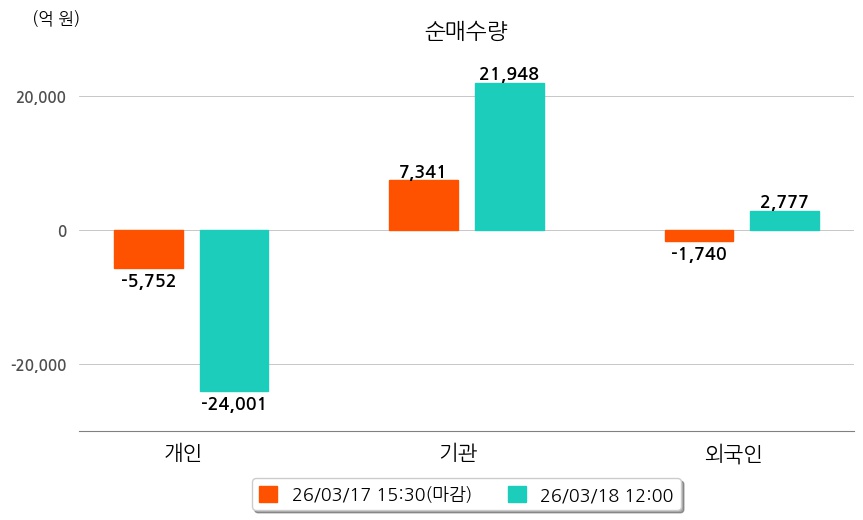 투자자별 동향을 살펴보면 기관은 21,948억 원 순매수했으며, 외국인은 2,777억 원 순매수했다. 개인은 24,001억 원 순매도했다.