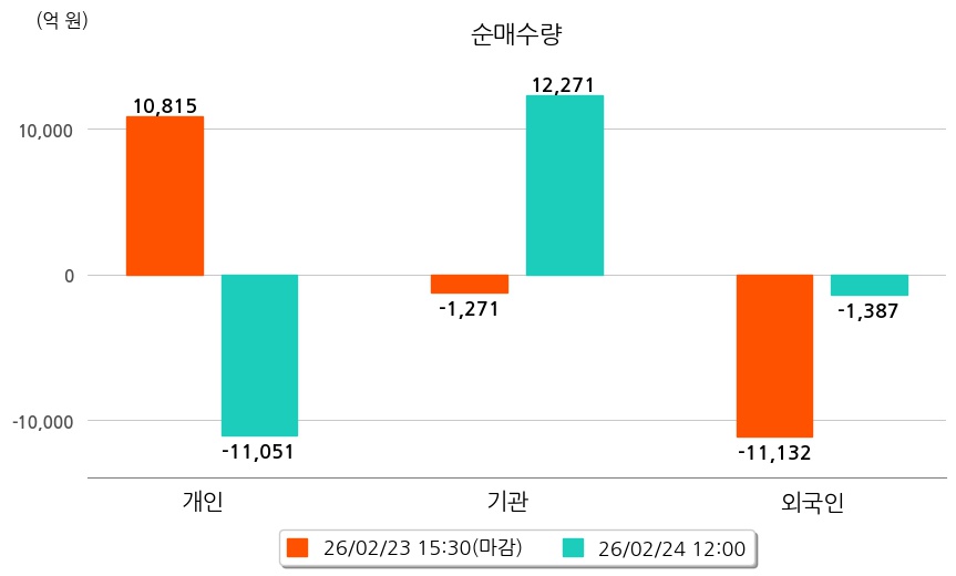 투자자별 동향을 살펴보면 기관은 12,271억 원 순매수했으며, 외국인은 1,387억 원 순매도했다. 개인은 11,051억 원 순매도했다.