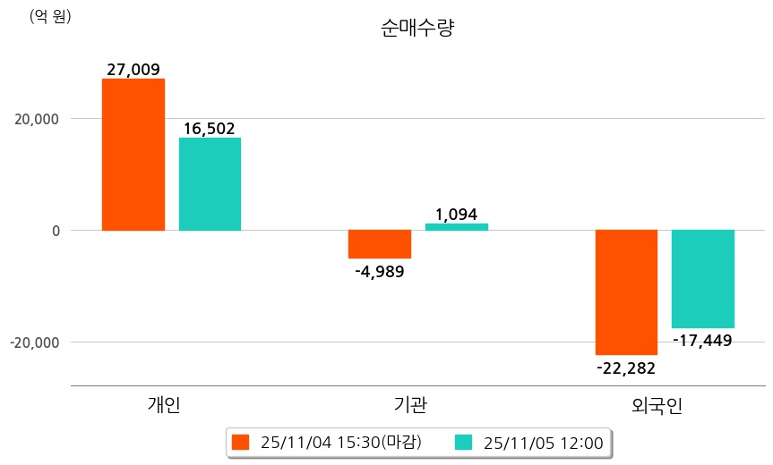 투자자별 동향을 살펴보면 기관은 1,094억 원 순매수했으며, 외국인은 17,449억 원 순매도했다. 개인은 16,502억 원 순매수했다.