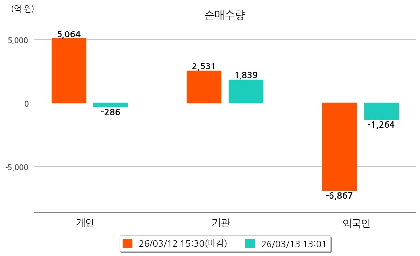 투자자별 동향을 살펴보면 기관은 1,839억 원 순매수했으며, 외국인은 1,264억 원 순매도했다. 개인은 286억 원 순매도했다.