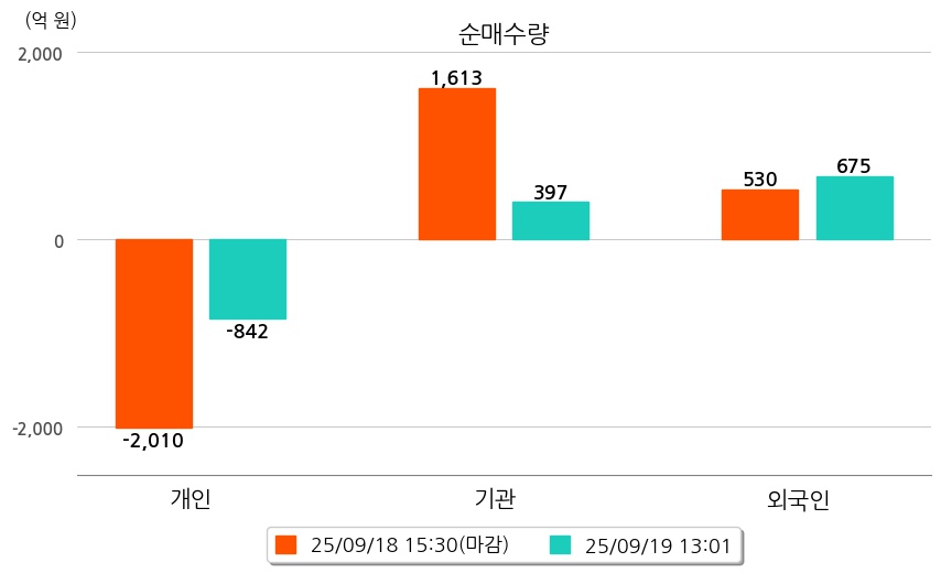 투자자별 동향을 살펴보면 기관은 397억 원 순매수했으며, 외국인은 675억 원 순매수했다. 개인은 842억 원 순매도했다.