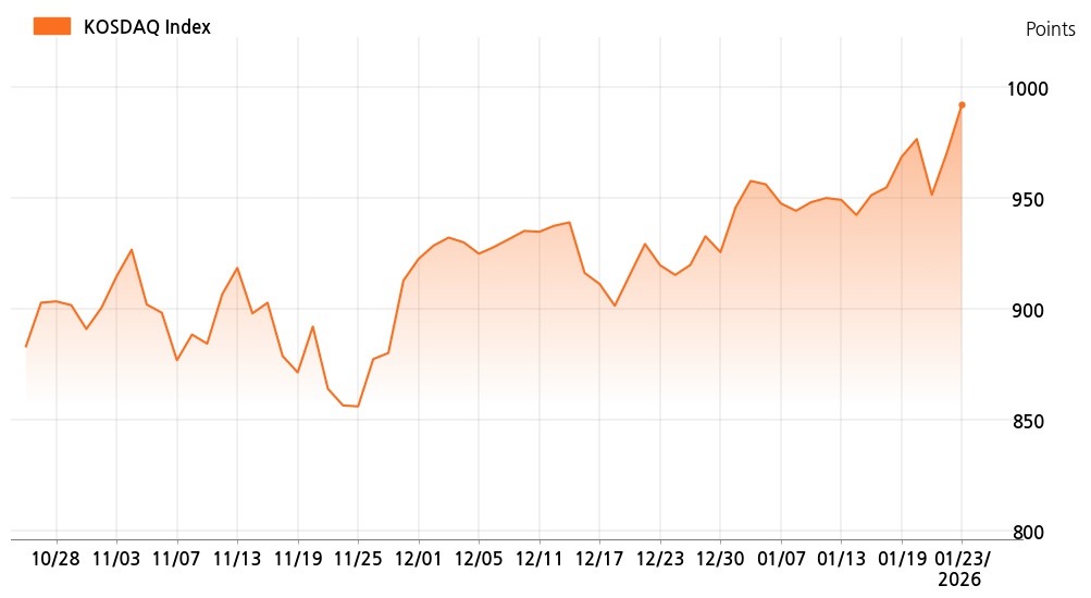 23일 오후 1시 코스닥(992.12p, 21.77p, +2.24%)는 기관 매수가 늘면서 상승세를 보이고 있다.