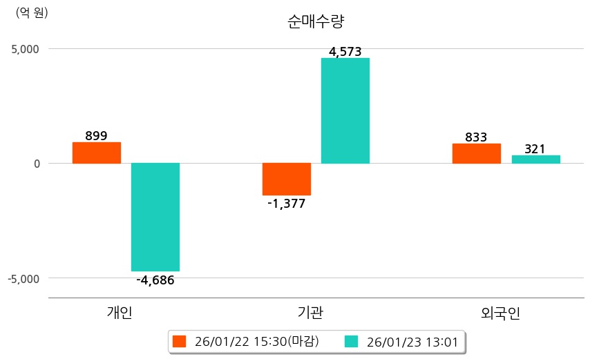 투자자별 동향을 살펴보면 기관은 4,573억 원 순매수했으며, 외국인은 321억 원 순매수했다. 개인은 4,686억 원 순매도했다.