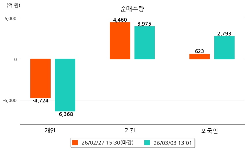 투자자별 동향을 살펴보면 기관은 3,975억 원 순매수했으며, 외국인은 2,793억 원 순매수했다. 개인은 6,368억 원 순매도했다.