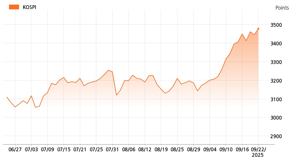 22일 오후 1시 코스피(3,478.56p, 33.32p, +0.97%)는 외국인 매수가 늘면서 상승세를 보이고 있다.