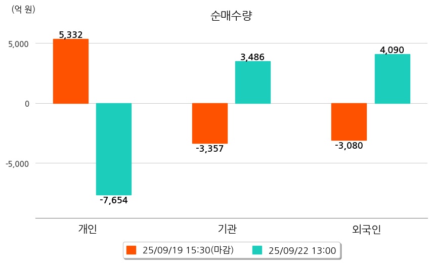 투자자별 동향을 살펴보면 기관은 3,486억 원 순매수했으며, 외국인은 4,090억 원 순매수했다. 개인은 7,654억 원 순매도했다.