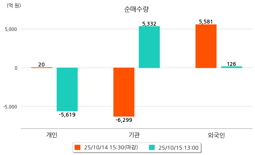 투자자별 동향을 살펴보면 기관은 5,332억 원 순매수했으며, 외국인은 126억 원 순매수했다. 개인은 5,619억 원 순매도했다.