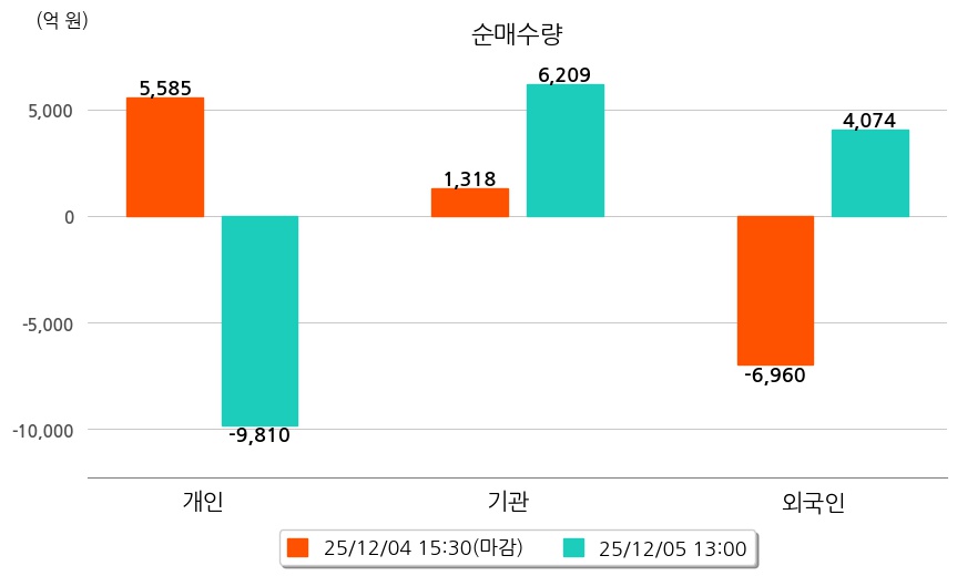 투자자별 동향을 살펴보면 기관은 6,209억 원 순매수했으며, 외국인은 4,074억 원 순매수했다. 개인은 9,810억 원 순매도했다.