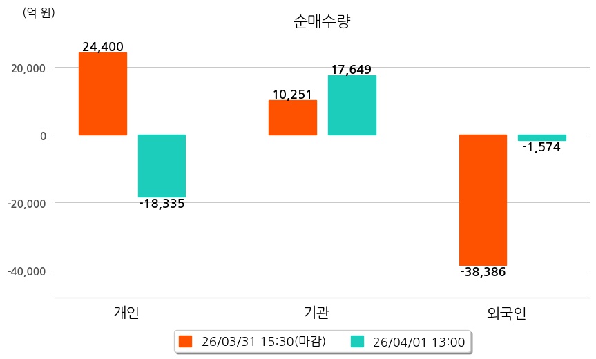 투자자별 동향을 살펴보면 기관은 17,649억 원 순매수했으며, 외국인은 1,574억 원 순매도했다. 개인은 18,335억 원 순매도했다.