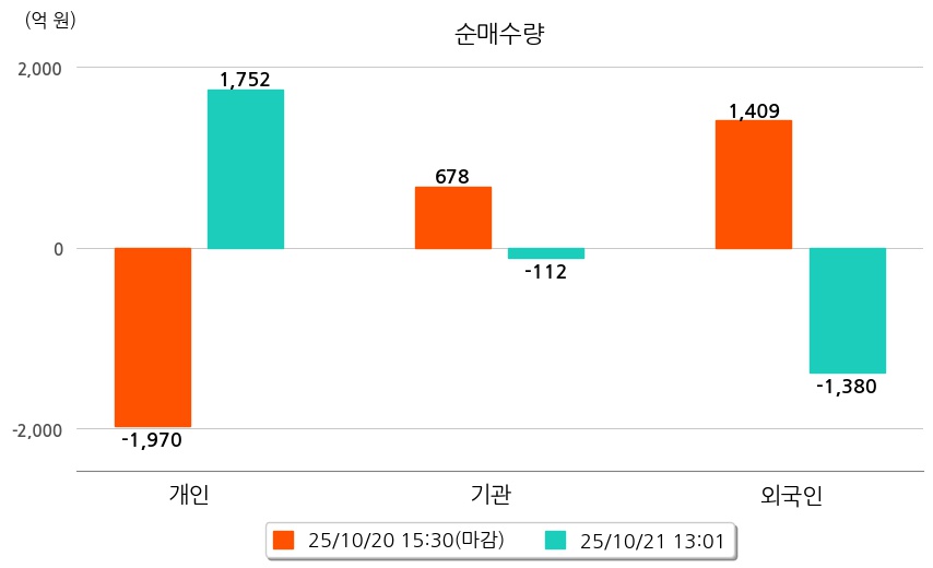 투자자별 동향을 살펴보면 기관은 112억 원 순매도했으며, 외국인은 1,380억 원 순매도했다. 개인은 1,752억 원 순매수했다.