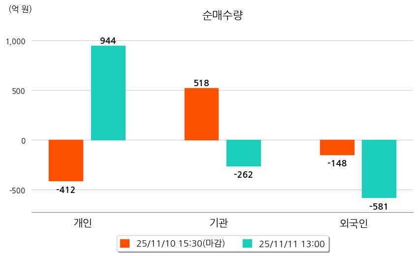 투자자별 동향을 살펴보면 기관은 262억 원 순매도했으며, 외국인은 581억 원 순매도했다. 개인은 944억 원 순매수했다.
