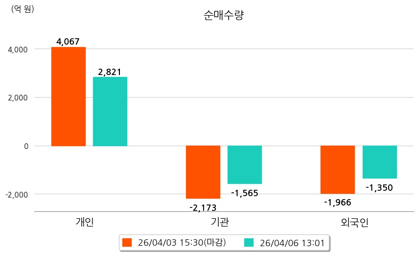 투자자별 동향을 살펴보면 기관은 1,565억 원 순매도했으며, 외국인은 1,350억 원 순매도했다. 개인은 2,821억 원 순매수했다.