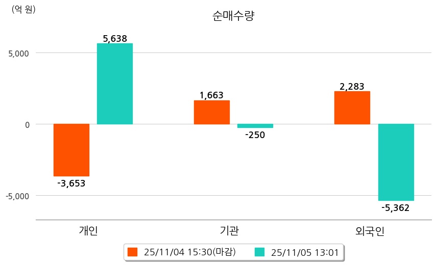 투자자별 동향을 살펴보면 기관은 250억 원 순매도했으며, 외국인은 5,362억 원 순매도했다. 개인은 5,638억 원 순매수했다.