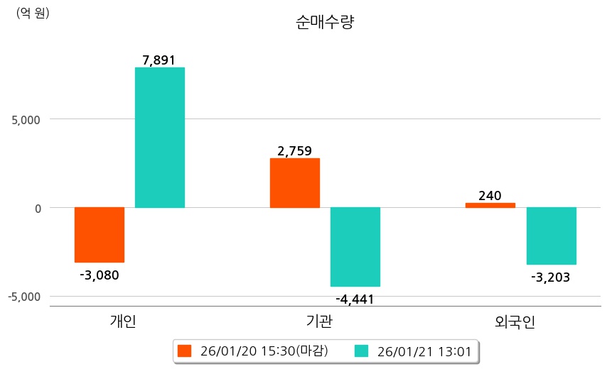 투자자별 동향을 살펴보면 기관은 4,441억 원 순매도했으며, 외국인은 3,203억 원 순매도했다. 개인은 7,891억 원 순매수했다.