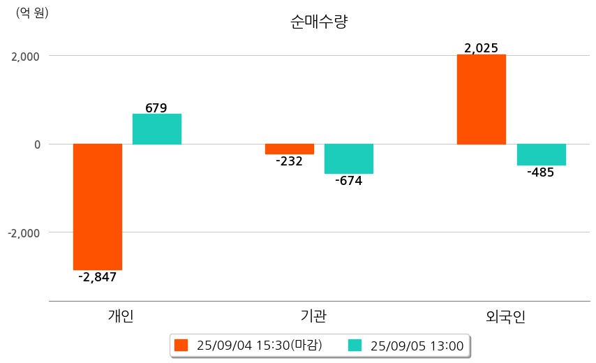 투자자별 동향을 살펴보면 기관은 674억 원 순매도했으며, 외국인은 485억 원 순매도했다. 개인은 679억 원 순매수했다.