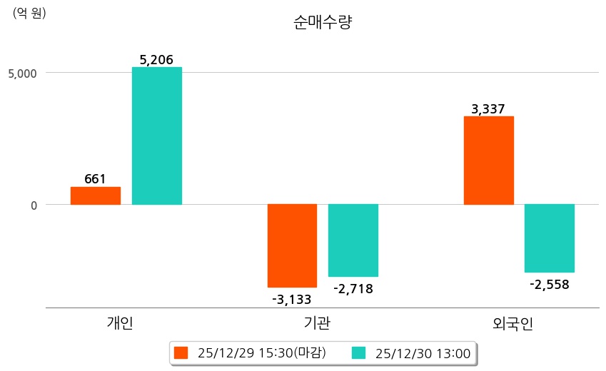 투자자별 동향을 살펴보면 기관은 2,718억 원 순매도했으며, 외국인은 2,558억 원 순매도했다. 개인은 5,206억 원 순매수했다.