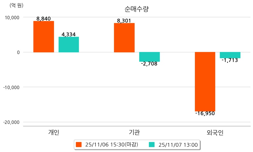 투자자별 동향을 살펴보면 기관은 2,708억 원 순매도했으며, 외국인은 1,713억 원 순매도했다. 개인은 4,334억 원 순매수했다.