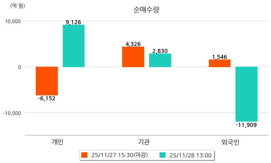 투자자별 동향을 살펴보면 기관은 2,830억 원 순매수했으며, 외국인은 11,909억 원 순매도했다. 개인은 9,126억 원 순매수했다.