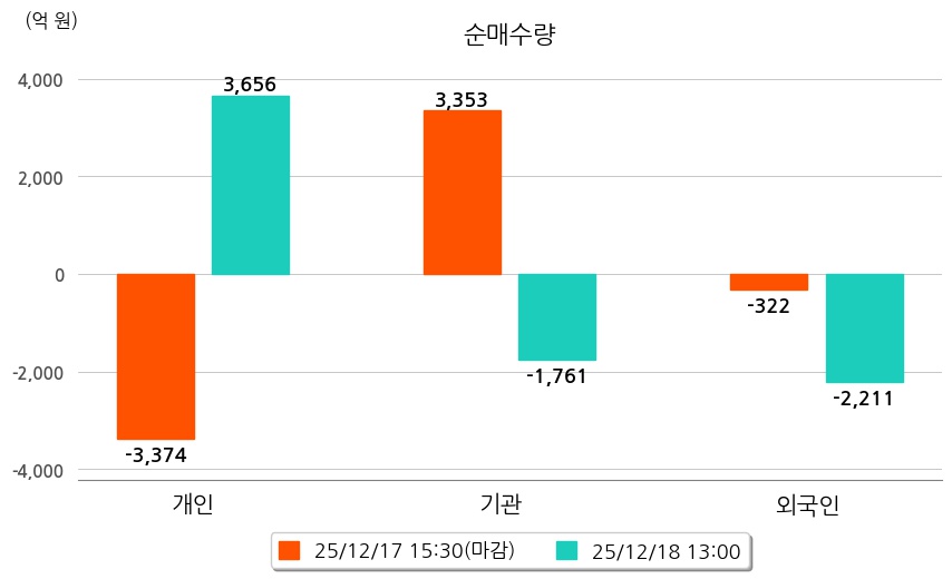 투자자별 동향을 살펴보면 기관은 1,761억 원 순매도했으며, 외국인은 2,211억 원 순매도했다. 개인은 3,656억 원 순매수했다.