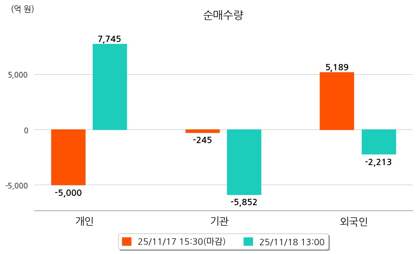 투자자별 동향을 살펴보면 기관은 5,852억 원 순매도했으며, 외국인은 2,213억 원 순매도했다. 개인은 7,745억 원 순매수했다.