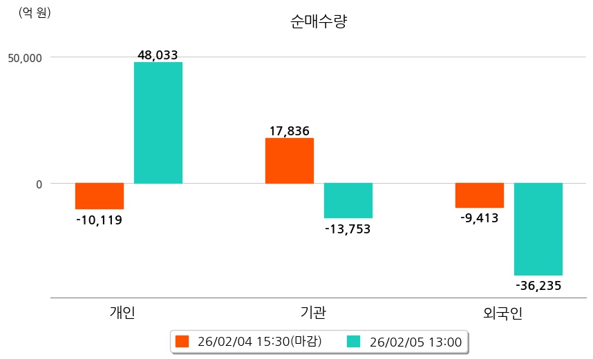 투자자별 동향을 살펴보면 기관은 13,753억 원 순매도했으며, 외국인은 36,235억 원 순매도했다. 개인은 48,033억 원 순매수했다.